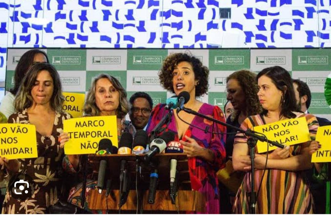As deputadas seguraram papéis com os escritos: “Não vão nos intimidar”, “Não vão nos calar” e “Marco temporal, não”. Também estavam presentes outras deputadas e deputados de esquerda.